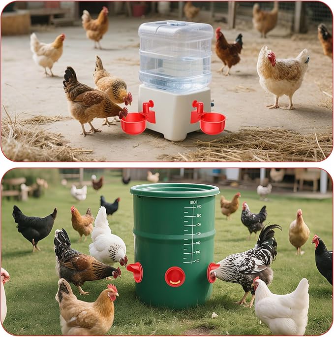 • Automatic Gravity Feed: Auto chicken waterer cups feature automatic gravity-fed design, water flows automatically without tabs to push. The cups are always half full and not spill out of the container. Automatic feeding ports provide constant feed available to poultry, eliminating feed spillage and mess. Constant supply of fresh drinking water for your flocks, poultries, ducks, geese, turkeys, quails, with our chicken water cups