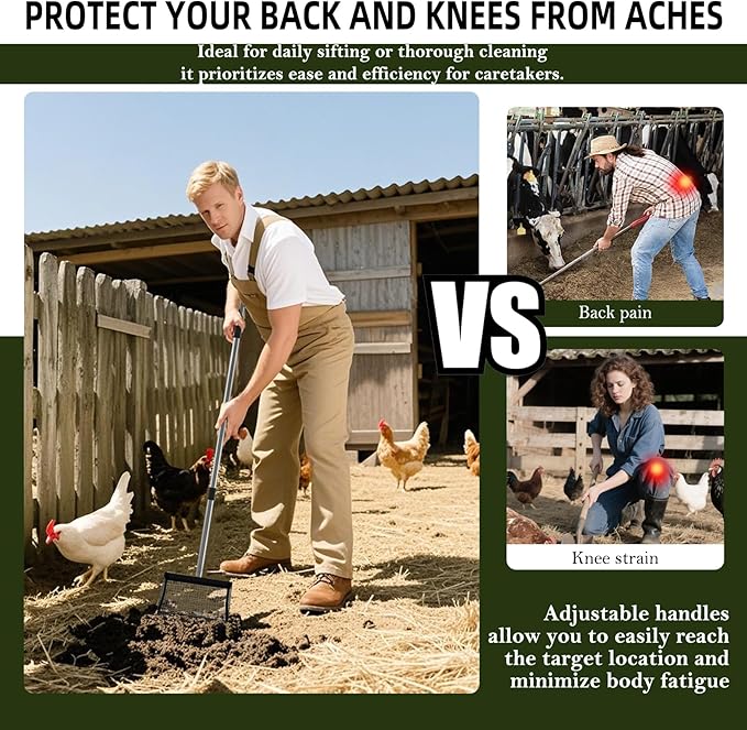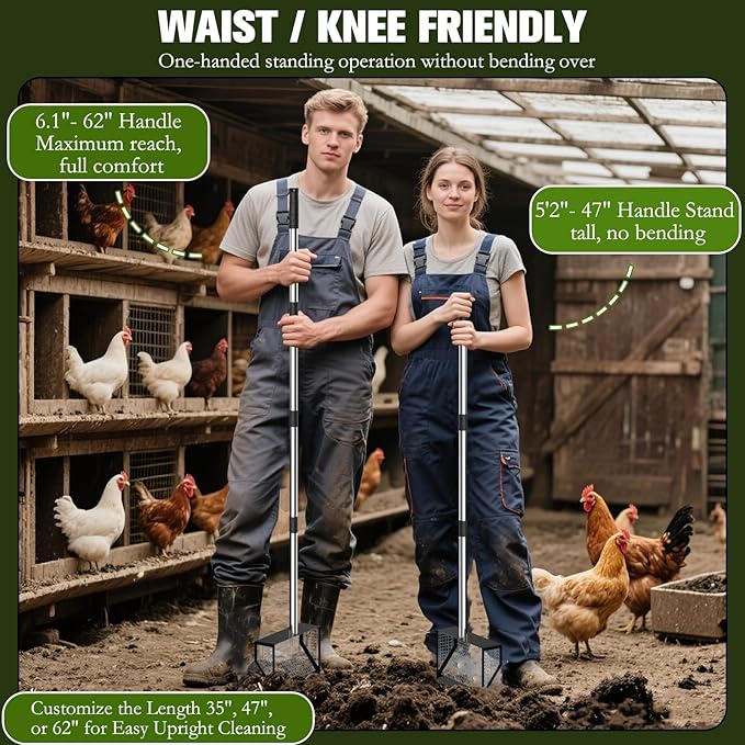 • 【Adjustable Handle with Ergonomic Grip】: Customize your cleaning comfort with a handle that extends to four heights: 22.5", 34.2", 48.8", and 61.8". Twist and lock into your ideal position. The non-slip grip offers maximum control and reduces back strain—say goodbye to bending over with a standard chicken pooper scooper.