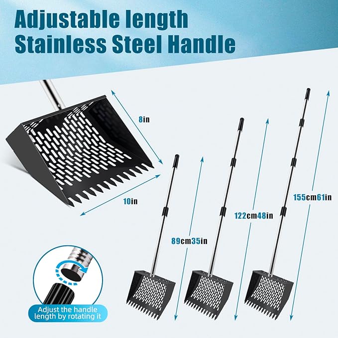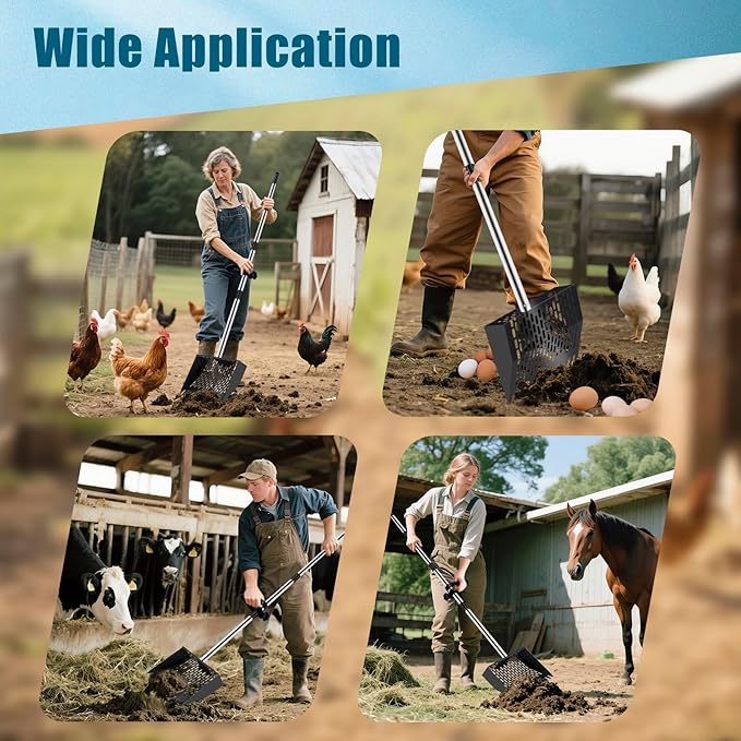 • 【Chicken Poop Scooper Handheld】The sand sifter shovel adjustable function makes it easy to use in various scenarios and for people of different heights. Can be adjustable to 36",49", and 61",you can adjust it to the most suitable length according to your own needs.An ergonomic chicken pooper scooper that adapts to every coop layout