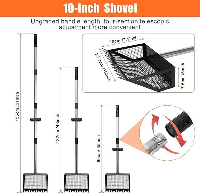 • Multi-function Sifting Shovel - Different lengths for different tasks. This sifting shovel for sand can be adjusted to the right length to be used as a cat litter scooper, beach search sand scoop and cow pens shovel, etc. Perfect for cleaning chicken litter, horse apples, dog piles, and cleaning out the sandbox. After use, the chicken coop accessories is very easy to clean with just water flushing