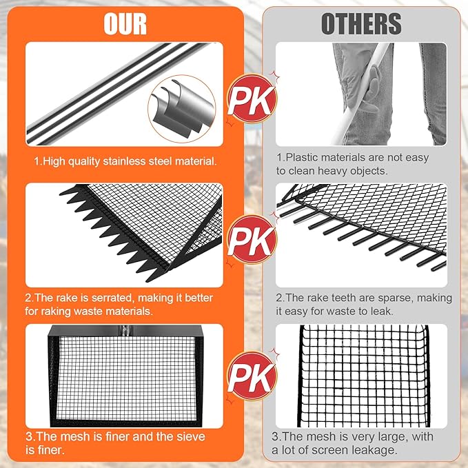 • 2 in1 Chicken Poop Scooper and Rake: First, you can use this chicken poop scooper to cleaning coops through sifting the poops from sand or wood chips in chicken coop. Then, this poop scooper can be used as a rake to clean chicken feathers, leaves or dead grass for a much cleaner coop environment for your animals. Save your money and energy