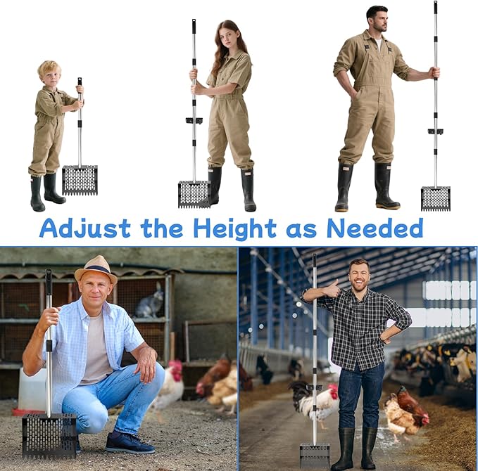 FHTONGE Heavy Large 2-in-1 Chicken Poop Scoop and Rake with Grip, Adjustable 5 Lenghts 22-74" Metal Chicken Coop Scooper for Sand Hay Bedding Litter, Sifting Shovel for Farm Livestock Poultry Garden