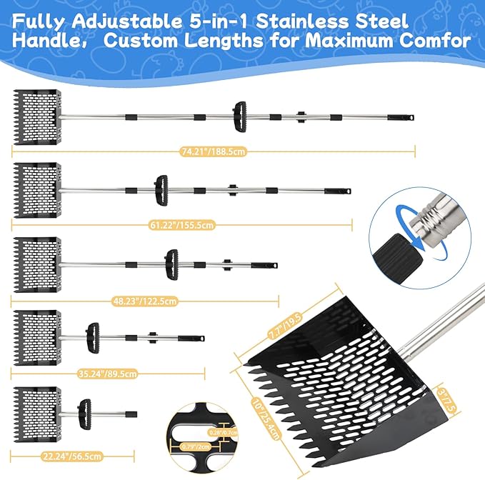 • Adjusts to 5 Different Lengths: The handle can be adjusted to 5 lengths by adding or removing sections to suit any size person- 22.24"/56.5cm, 35.24"/89.5cm, 48.23"/122.5cm, 61.22"/155.5cm, 74.21"/188.5cm; It means you can make the chicken rake shorter for tight spaces or extend it when you are working standing up, reduces the need to keep bending crouching or squatting down; Save your back or knees!