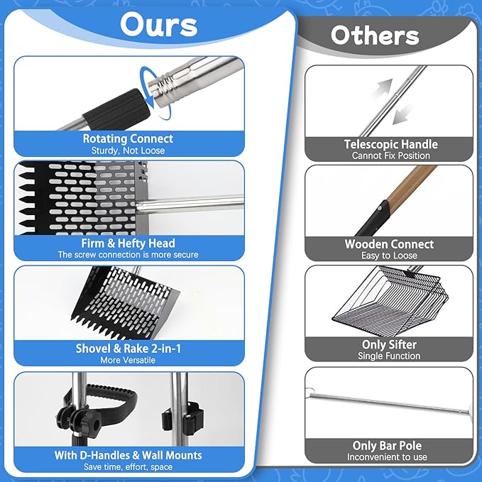 • Solid and Hefty: This goat pooper scooper is not some flimsy thing, does not bend no matter how heavy the substrate is; The shovel head is well made with heavy hard metal, no breaking even when scraping dried droppings off wooden roosts or rough surfaces, also holds up well even with damp litter or heavier clumps; Pole made with sturdy 304 stainless steel, it's designed for durability and won’t bend like plastic