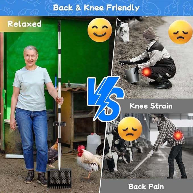 • Universal Tool: This multi-purpose horse poop scooper is known as a"do-it-all tool" to eliminate the need for additional tools that perform similar tasks; It is not only use in chicken coops (hemp/straw/sawdust bedding), but also sand filled farm goat stall, horse stable, cow shed ,rabbit pen, dog piles, hoggery or garden; Extra use: loosen soil, compost piles, gather legunes, shovel leaf, beach fun, separate stone.etc