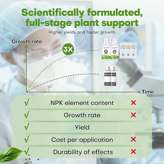 • Complete All-in-One Plant Food: Give your plants the perfect balance they crave. Our 800ml A&B hydroponic nutrients solution is a complete hydroponic plant food formula, meticulously crafted to provide everything your vegetables, fruits, and flowers need for the entire growth cycle—from vigorous vegetative growth to prolific flowering and fruiting. Eliminate the guesswork of mixing multiple bottles.