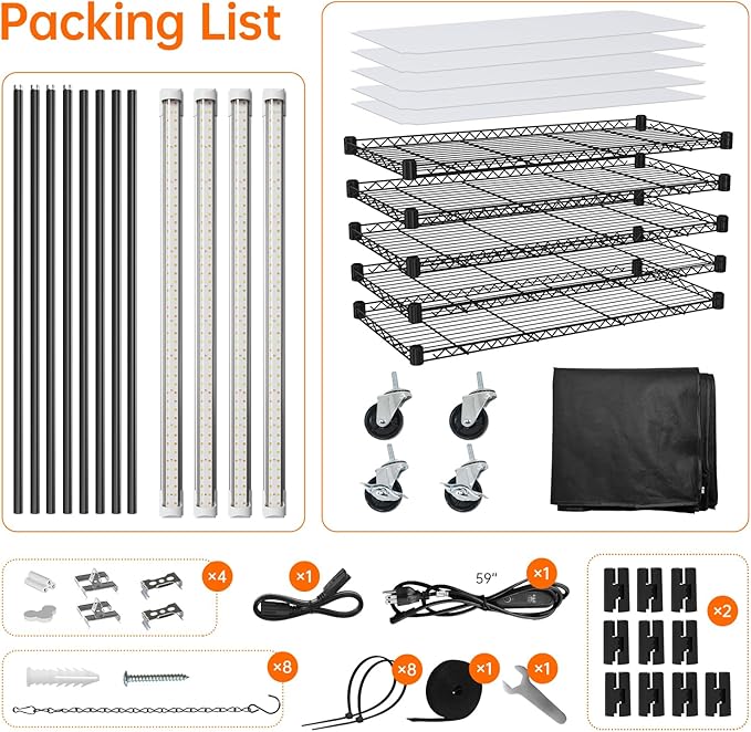 • Tool-Free Assembly & Leak-Proof Design - Quick to assemble without tools, this plant shelf with grow light includes 5 PP waterproof mats to protect lights from spills. Complete with 4 lights, metal grow shelves, connectors, and accessories, it’s a hassle-free indoor gardening system for beginners and experts alike