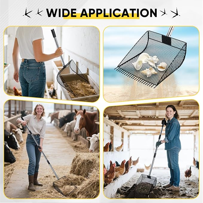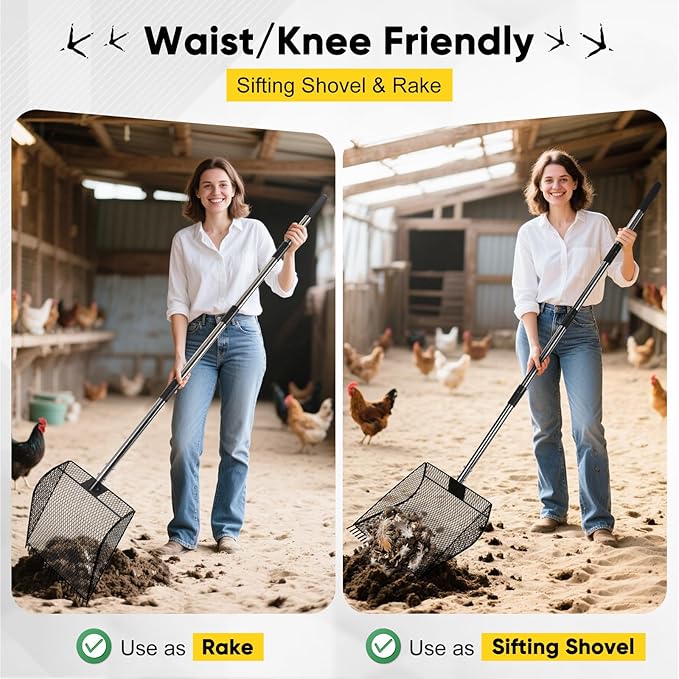 • 【Efficiently Multi-funtion Sifter Shovel】 Enlarged design doubles cleaning efficiency. This chicken coop scoop can be used for large-scale cleaning work in chicken coops, and can be used as a rake to clean chicken feathers or litter in the chicken coop, also can be adjusted to the right length to be used as a cat litter scooper, beach search sand scoop and cow pens shovel, etc