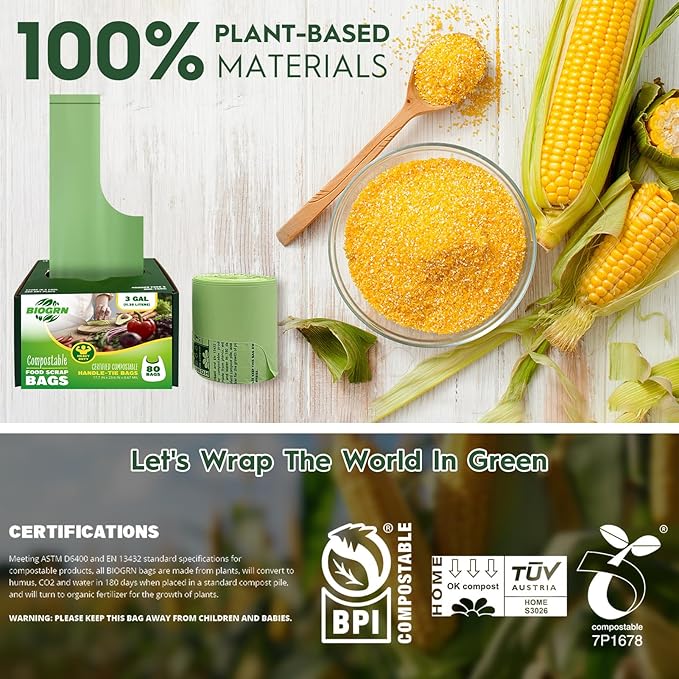 • Sustainable Material:Made from a premium PLA+PBAT blend, these 3 gallon compost bags break down completely in compost systems within 180 days, turning into nutrient-rich humus. Unlike regular bags, they leave no harmful residues, making them perfect for food waste bags and environmentally-conscious households.
