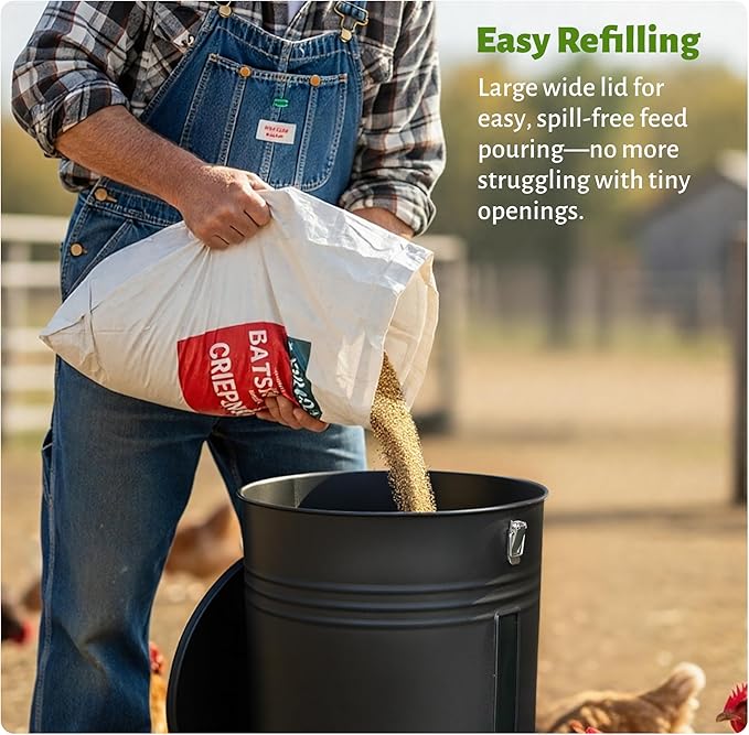 • Rust-Proof Metal Construction: Built with powder-coated steel construction, this chicken feeder resists rust and corrosion for lasting outdoor durability. The sturdy metal build withstands daily coop activity without damage.