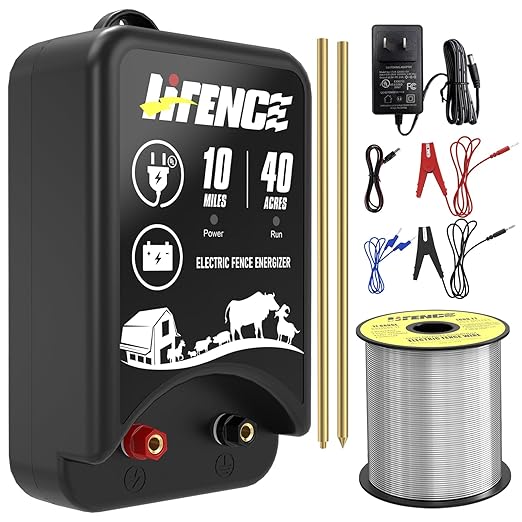 • 【High energy output Effective control range】 Having been designed for use with electric animal fences, the fence energizer is capable to control an area of 40 acres, and is compatible with most energized conductor wires.(And comes with1 spools of 1000ft Aluminum Electric Fence Wire)This Electric Fence Charge is equipped with a powerful 2 Joules output that ensures efficient and reliable power to your fence. Up to 10-Mile Range. and is compatible with most soil types.