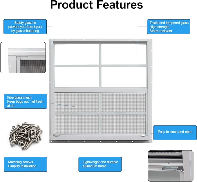 • 【Heavy Duty Shed Windows】Solid structure and thick aluminum, high strength tempered glass and fiberglass screen mesh, making it durable under all weather conditions.