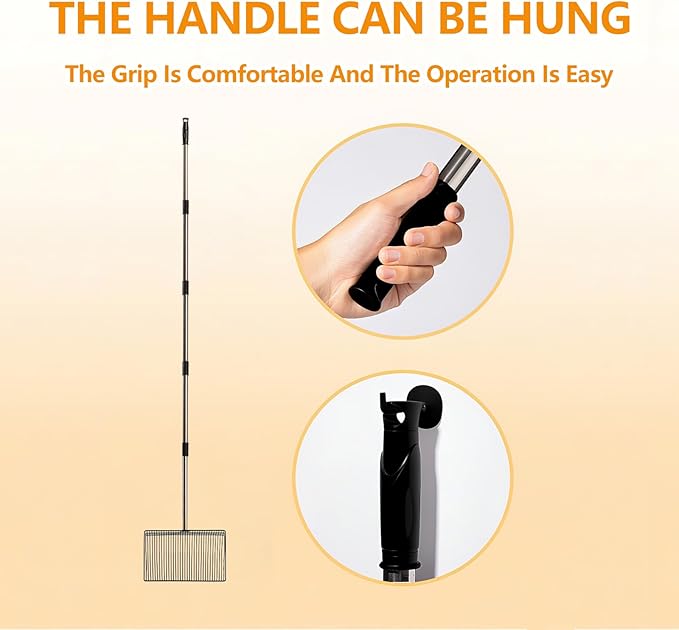 • 【Efficient Cleaning Performance】This coop scoop possess the 10*6.1 inch sturdy metal shovel head which features a 0.2 fine inch sieve mesh,sifting out even the smallest droppings in one pass,increasing the cleaning efficiency and ensuring a clean and hygienic environment for the chickens.