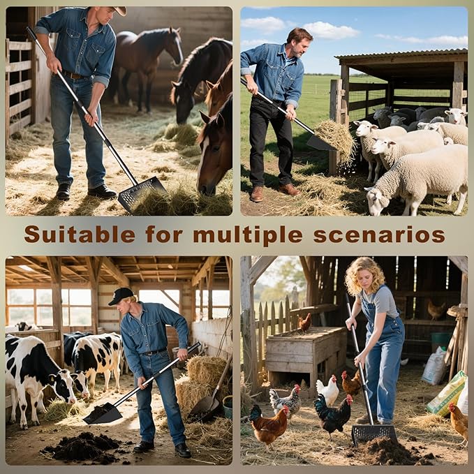 • Metal Chicken Coop Rake Scoop Combine Design: What sets this chicken coop shovel apart is its Metal rake teeth, able to make quick separation or removal of chicken manure and other waste. raking and sifting scoop Combine in one Farm Cleaning Tool