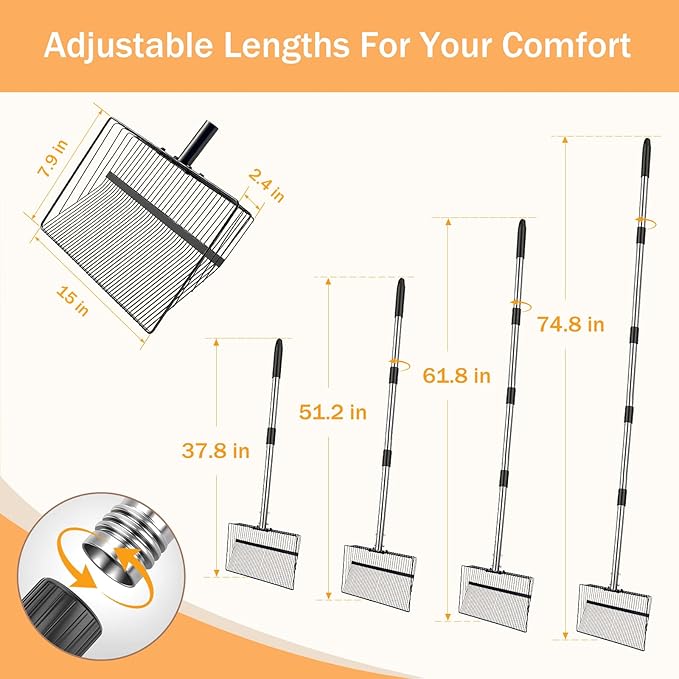 15inch Large Chicken Poop Scooper for Sand with Ergonomic Grip,Chicken Coop Accessories with 37" to 75" Adjustable Stainless Steel Handle - Heavy Duty Sifting Coop Scoop