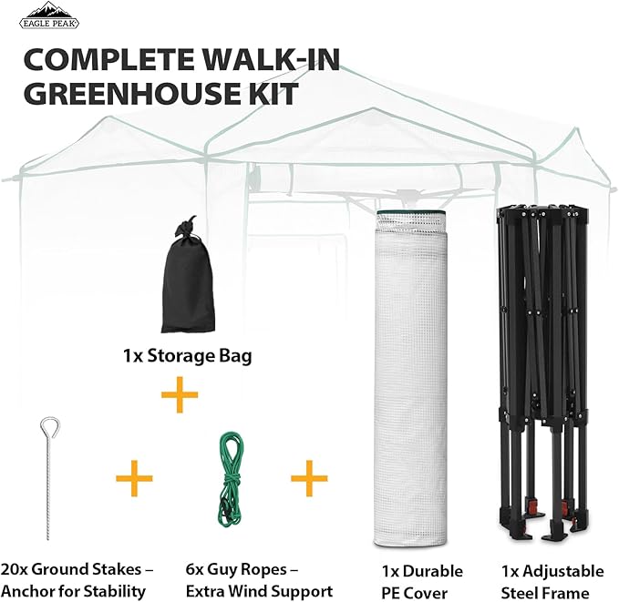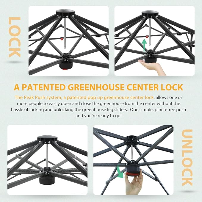• EASY SETUP: This pop up greenhouse with patented center lock technology supports one person setup in seconds. The pre-assembled frame and innovative Peak Push locking system delivers a quick setup. No tools required. Whether you're a seasoned gardener or just starting out, the EAGLE PEAK pop-up greenhouse for outdoors saves you time and hassle