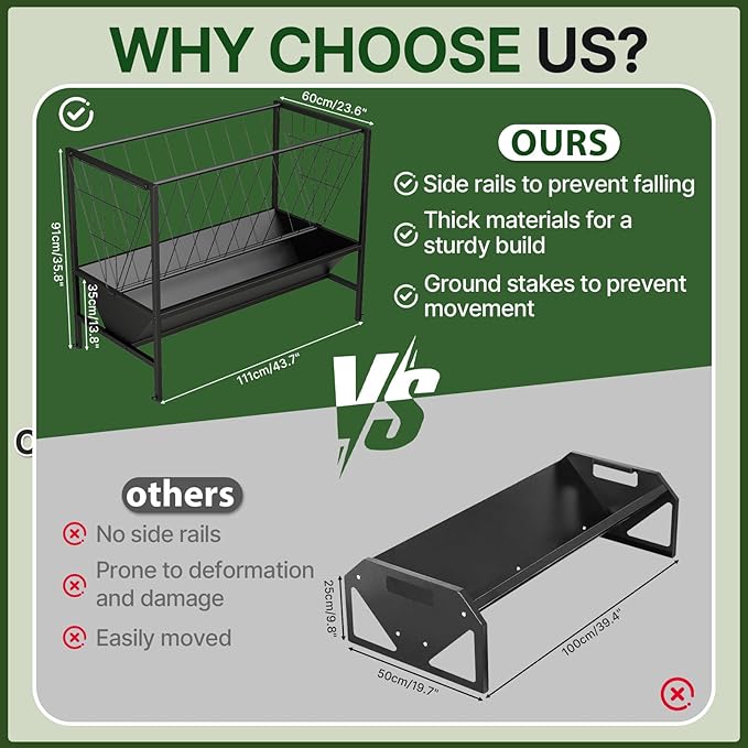 • 2.Built to Last with Heavy-Duty Steel: Crafted from thick galvanized steel with a weather-resistant black coating, this goat hay feeder is designed to endure tough outdoor conditions, season after season.