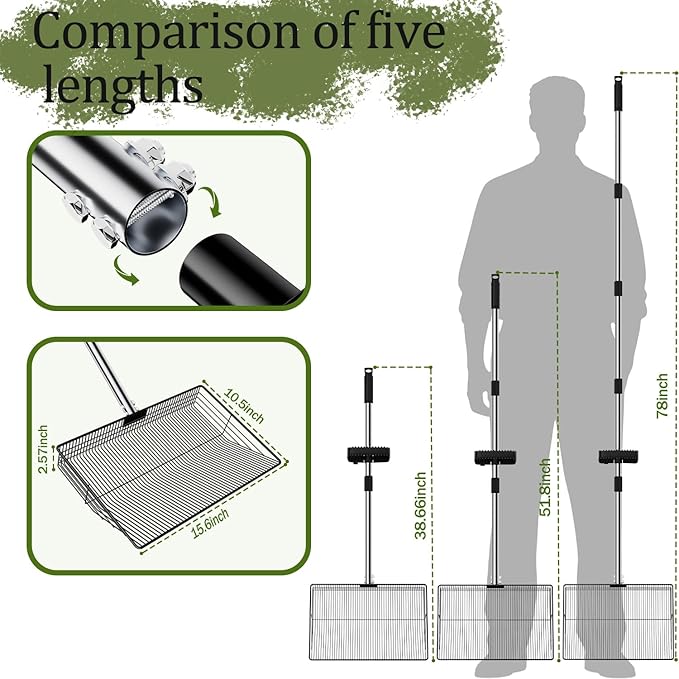 • 【Ergonomic Back Saver】 Knee-friendly 68" poop rake eliminates bending! Lightweight yet heavy-duty, this coop scoop tackles horse apples/dog piles effortlessly. Ideal chicken coop rake for seniors maintaining 10+ chicken coops or goat barns. Pro Tip: Use extended handle for sandbox cleaning!