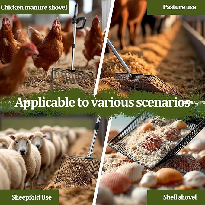 • 【Multi-Scene Workhorse】 More than poop shovel – it’s 5 tools in 1! Configure as: ✦ Leaf sifting shovel for yards ✦ Beach sand sifter ✦ chicken poop scoop for coops ✦ Horse/cow poop rake Essential the coop scoop for homesteaders and ranch hands.