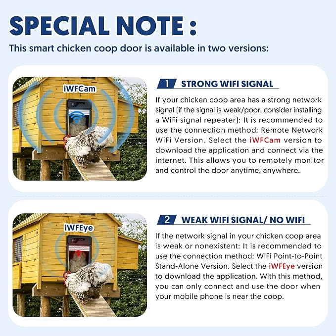 • 【Choose WiFi Hotspot or Network Version】Our wifi chicken coop automatic door is designed to meet your needs(camera supports only 2.4GHz Wi-Fi). You can choose between WiFi Hotspot version and WiFi Network version according to your WiFi signal strength and distance from your router. If the WiFi signal is weak, please use WiFi Hotspot version (non-long range). You can also add a WiFi repeater to boost the signal.