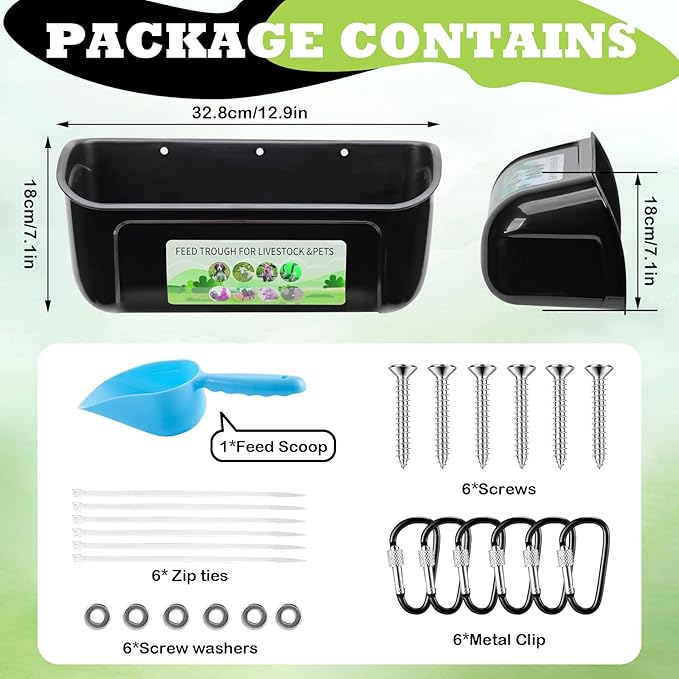 • Easy Mounting and Adjustment: Each livestock feeding container comes with 2 heavy-duty metal clips, screws & nylon zip ties for hanging, or as a portable feeder that's quick to install or move. Hang the trough on a chicken coop, garden netting, rail or fence. And our nylon zip use one-way locking clips ensures that the buckle locks more securely and is less likely to be knocked out by animals. Easily adjust the hanging height as poultry grows. And we included a free feed scoop for you