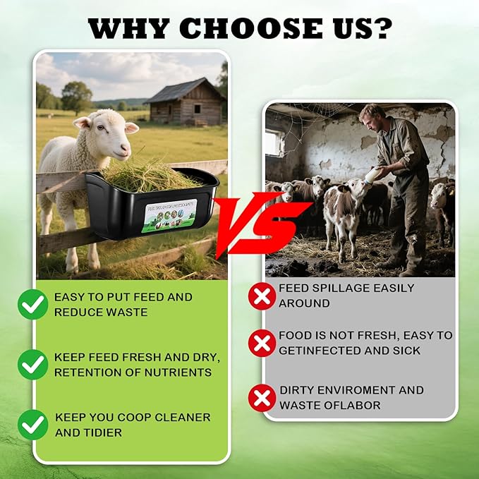 • No Waste, No Spill, No Mess: Hanging fence feed trough unlike traditional ground feeding methods, hanging off the ground is minimize feed spillage, promoting healthy eating habits and reducing waste. Keep feed fresh and dry for your livestock's optimal nutrition. Say goodbye to a messy farm and chicken coop