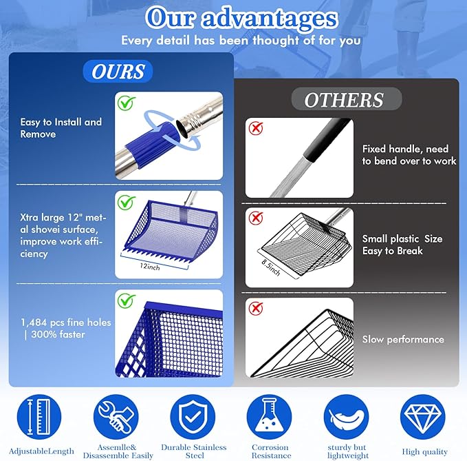 • Large-Capacity Metal Chicken Poop Scooper : Constructed with a heavy-duty metal shovel head and rake, paired with a 304 stainless steel handle and an adjustable soft rubber grip, it is suitable for use year-round. The metal-toothed chicken manure shovel head measures 12 inches in width, with a curved groove design significantly increasing the shovel's capacity, enabling it to scoop and sift waste in a single pass, greatly enhancing work efficiency.