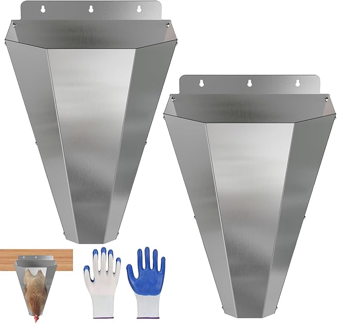 Medium Chicken Cone, Stainless Steel Poultry Restraining Cone with 2 Pairs of Safety Gloves, Flat Back Design, Chicken Processing Equipment for Laying Hens, Broilers, and Turkeys up to 8 lbs (2 Pack)