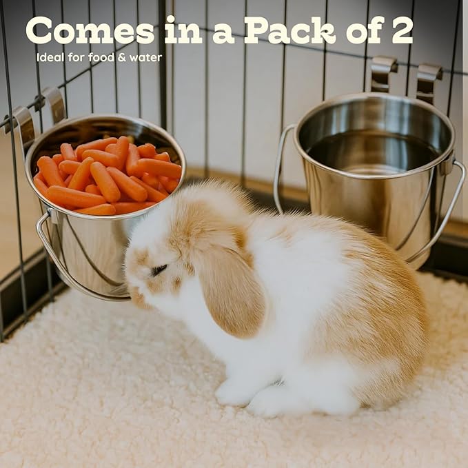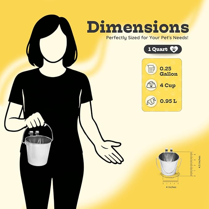 1 Quart Stainless Steel Flat Sided Pail with Dual Hooks | Hanging Bucket for Dog, Cat, Birds & Small Animals | Food & Water Bowl Fits Kennels, Crates & Cages | Multipurpose Use, Pack of 2