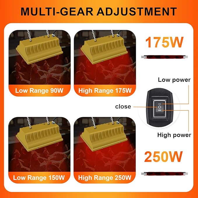 • 【Adjustable Temperature Range】Our heat lamp comes with two different wattage lamps (175W and 250W) and two adjustable settings, allowing you to adjust the temperature accordingly.