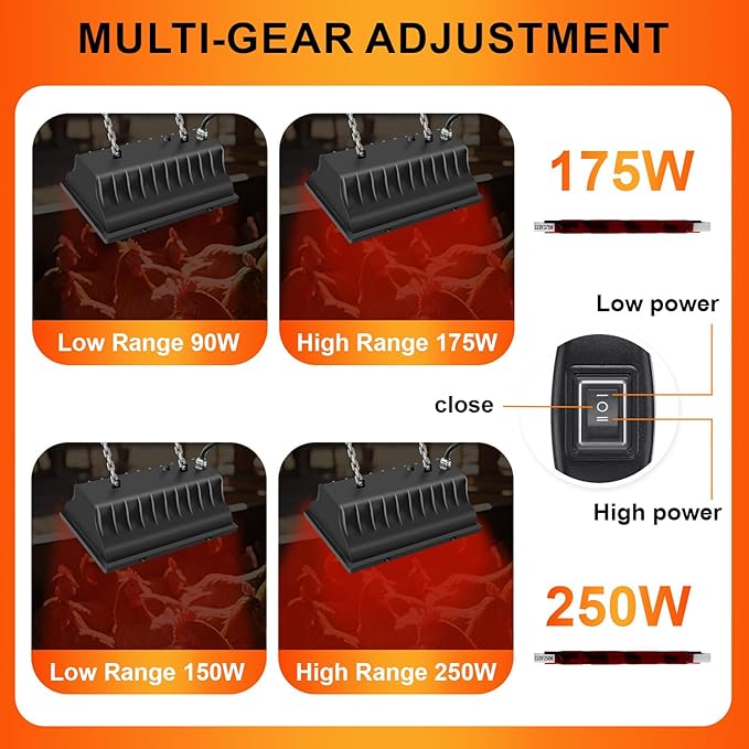 • 【Adjustable Temperature Range】Our heat lamp comes with two different wattage lamps (175W and 250W) and two adjustable settings, allowing you to adjust the temperature accordingly.