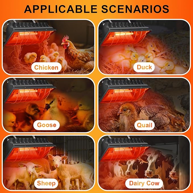 • 【Chicken Heater】This UL-compliant heating lamp features overheat protection, rapid heating, and a large heating area. Its infrared light source is harmless to your pets, keeping them happy all winter long.