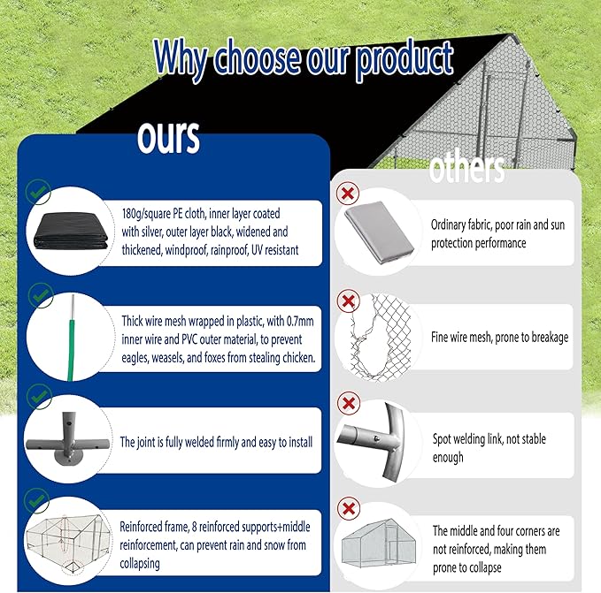 • chicken coop kits:We have equipped you with a complete set of chicken cage installation parts,300pcs 4mm heavy duty zip ties,16pcs U-shaped ground nails,20 elastic cords,4m wide black inner silver coated UV resistant waterproof PE cloth.