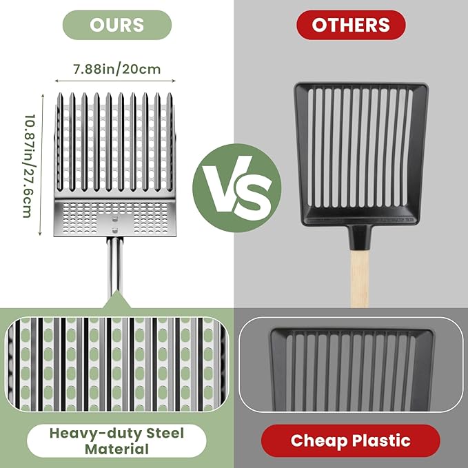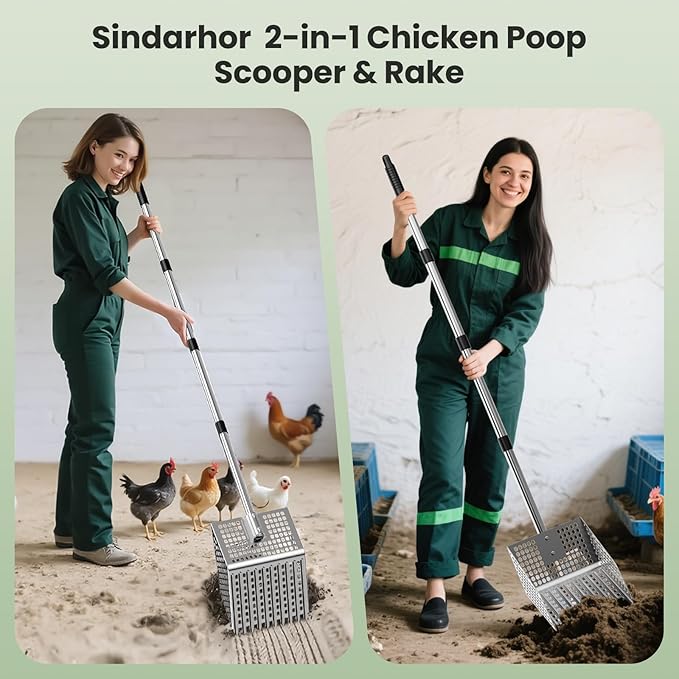 • 2-in-1 Chicken Poop Scoop & Rake: No more switching between rakes and shovels! Our design combines a sturdy scoop and ergonomic rake in a single tool. Quickly loosen clumped bedding with the rake teeth, then seamlessly flip to scoop and sift waste – all without missing a beat, and waste sifter with strainer holes saves dedding, too!