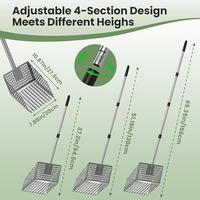 Stainless Steel Chicken Poop Scooper & Rake - Heavy-Duty 2-in-1 Sand Sifter Shovel with Long Handle Adjustable Length for Coops & Small Farms