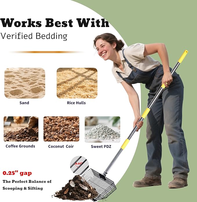 • 3-in-1 Chicken Coop Cleaning Tool -Scoop, Rake & Sift at Once: Clean your chicken coop, run, or poop shelf in minutes. Break up stuck droppings, rake bedding flat, and sift clean sand or coffee grounds all with one sturdy tool. Designed for backyard chicken keepers, small farms, and homesteaders, making daily chores faster, cleaner, and less tiring.