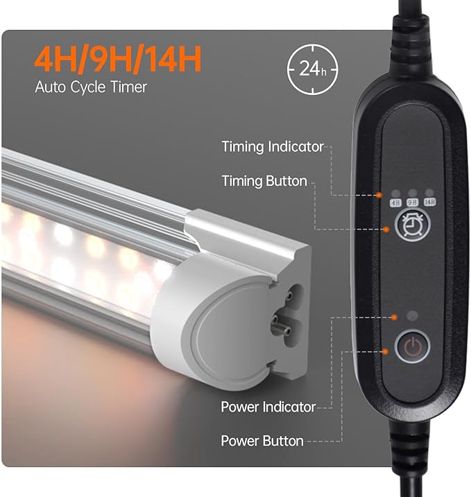 • Convenient Timer Function - The integrated timer feature allows you to effortlessly set the grow light to turn on and off automatically at your preferred intervals (4, 9, or 14 hours). This guarantees your plants receive consistent attention, whether you’re on vacation or busy with work