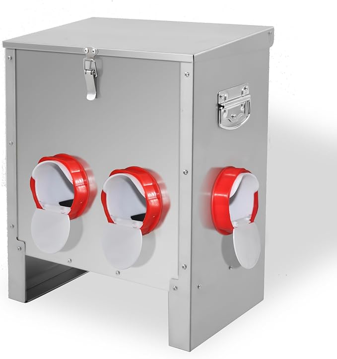 • Durable Galvanized Steel Construction with Secure Locks:Crafted from heavy-duty galvanized steel,built to resist rust,corrosion,and harsh weather.Dual padlockable lid locks deter raccoons, weasels,and pests,ensuring feed safety in both indoor and outdoor coops.