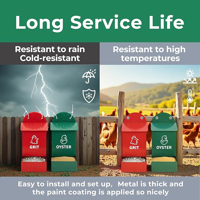 • Upgraded 5LB Large Capacity Design: Each feeder holds up to 5 pounds of grit or oyster shell—perfect for 6–12 chickens. Feed lasts up to 13 days, reducing refill frequency and keeping your coop organized.
