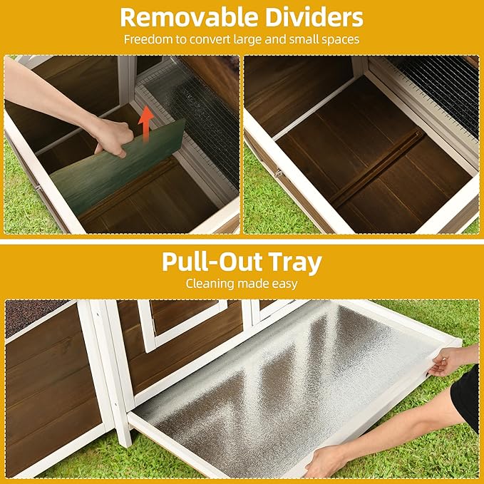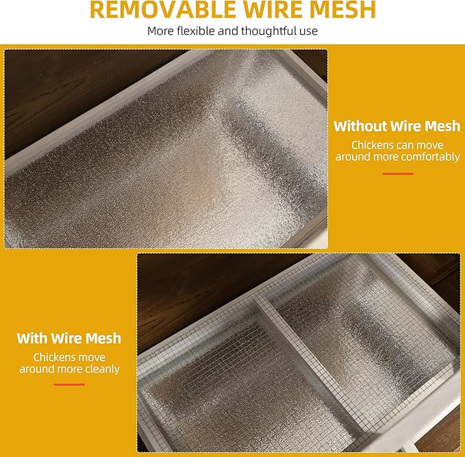 • Easy-Clean Removable Tray: Deep slide-out droppings tray & detachable heavy-duty wire mesh floor. Separates chickens from waste for a cleaner, healthier flock