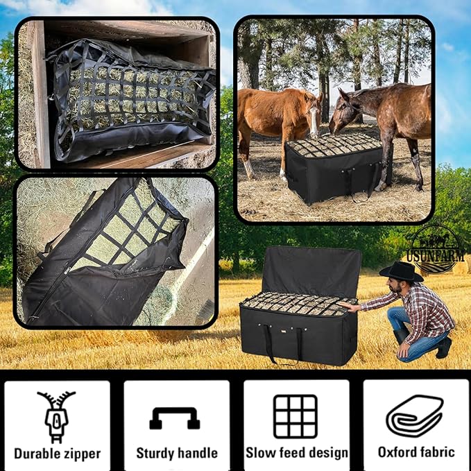 • 【Slow feeding net design】: The upper opening of the hay bag adopts a zipper style mesh slow feeding design, and the small holes can help the horse slow down when eating, providing slow feeding for your livestock. It can promote healthy eating habits in horses, avoiding the risk of overeating and digestive problems. This design helps regulate hay consumption and meet the needs of feeding multiple animals simultaneously.