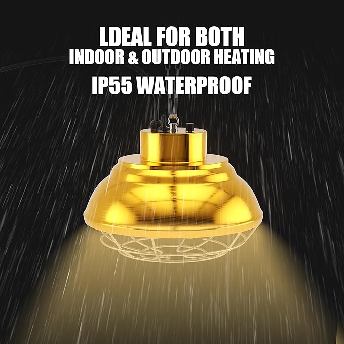 • Ultra-Safe Aluminum Alloy Enclosure: Encased in a waterproof, shatterproof, and anti-scald aluminum alloy shade with reinforced stainless steel mesh. This dual-layer design prevents chickens from contacting the heater, eliminating burn risks and ensuring all-weather protection