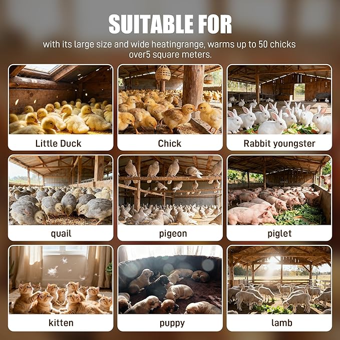 • Instant & Efficient Carbon Fiber Heating: Our advanced carbon fiber heating element delivers warmth in just 1-2 seconds and boasts a 100,000-hour lifespan. Ensure continuous, safe, and energy-efficient heating for your poultry during harsh winter months