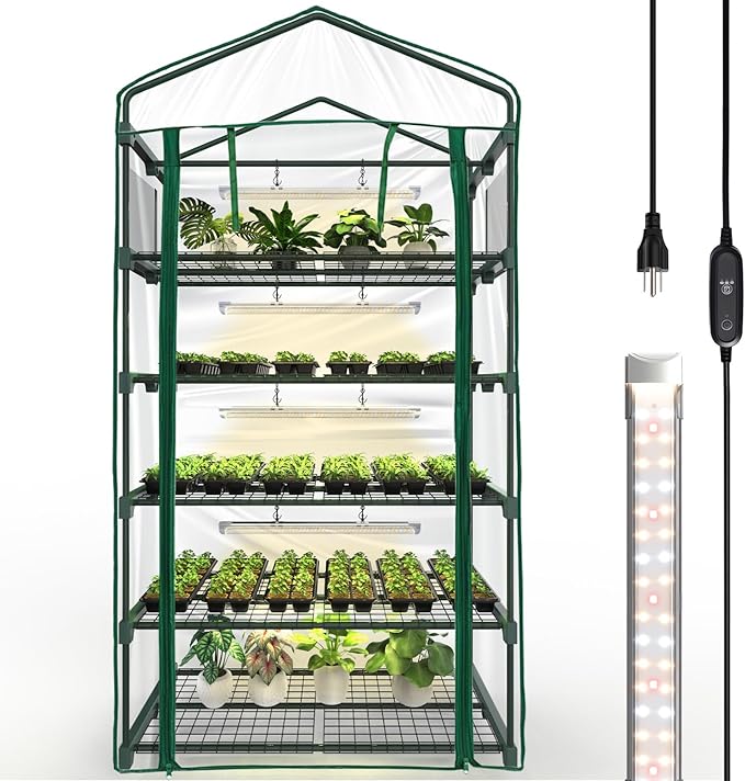 • Space-Efficient 5-Tier Design: This 5-tier indoor greenhouse (40.2" L x 18.9" W x 74.8" H) maximizes growing space vertically while occupying minimal floor area. Each spacious tier accommodates multiple plants and seed trays—holding 1x32-cell trays and 12x12-cell trays simultaneously—creating a versatile growing environment suitable for nurturing seedlings and organizing mature succulents