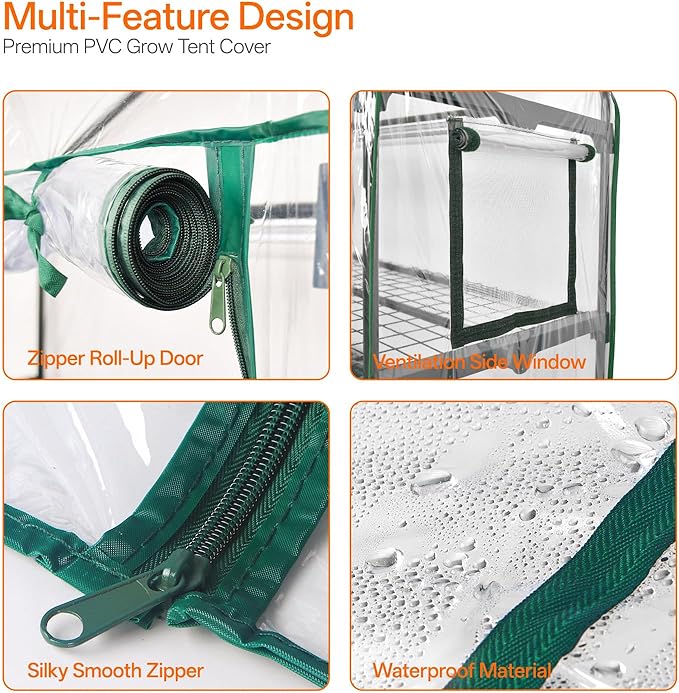 • Durable Tent with Enhanced Visibility & Ventilation: Crafted for indoor cultivation, this greenhouse PVC tent provides waterproof protection and clear visibility for plant monitoring. Dual side vents promote balanced airflow while the roll-up zipper door simplifies maintenance. Designed for easy assembly, the structure supports all growth phases from seed germination and vegetative development to flowering and fruiting stages