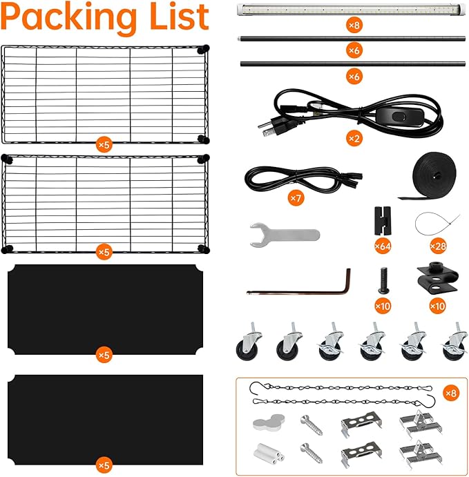 • Complete Grow Kit Included - Comes with 8 grow light strip, 7x 39.4" connectors, 2x 78.7" power cords, 8 plant shelves, 8 mats, 6 casters, and all installation hardware—ready to assemble