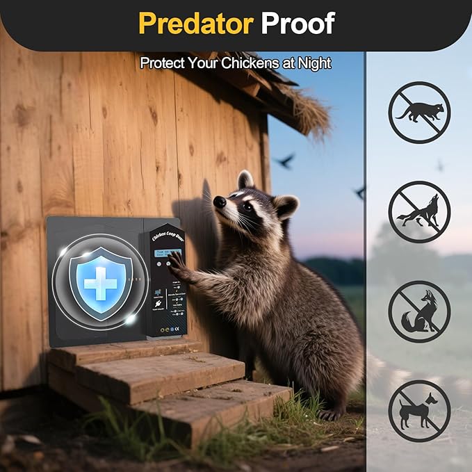 • 【Side-opening chicken coop door & safety anti-pinch】Our innovative horizontal opening chicken coop door design is more suitable for chicken cages than traditional vertical doors. It does not require additional overhead space and is more compatible with most chicken coop layouts—especially those with limited space above the door. Our anti-pinch coop door feature a pinch-proof design. When the built-in sensors detect chickens passing through, the door stops and reopens to prevent injury. At night, to prevent predators such as weasels and foxes from entering, the facility automatically locks after closing