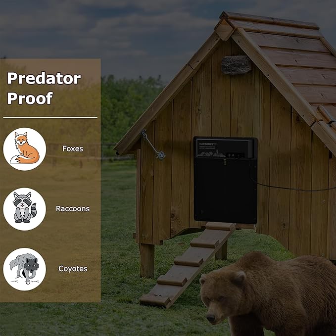 • Weather-Resistant: The auto chicken door is waterproof(IP65) and will work in snow, rain and dust from -15°F to 140°F (-26°C to 60°C). It has been rigorously tested for reliable performance in various weather conditions.