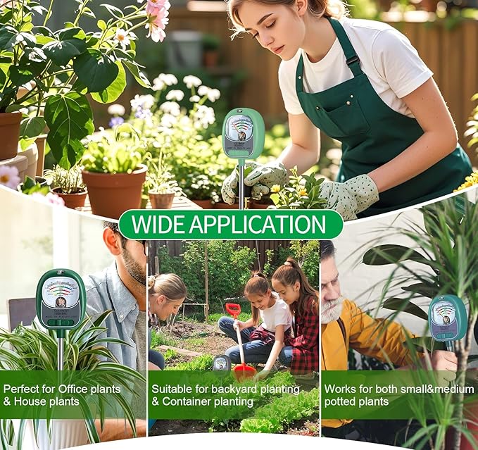 • NO Require Battery & Widely Use: This 4-in-1 soil test kit doesn't need an extra battery and is upgraded with a durable single soil testing probe which less hurts the roots, and can detect complex soil conditions(mixed-soil), can widely be used for indoor&outdoor garden, and all stages of Organic-gardening/Ornamental-Landscapes/small-trees/composting/pots, etc, You can buy one to understand more about your soil and enjoy the planting and harvest
