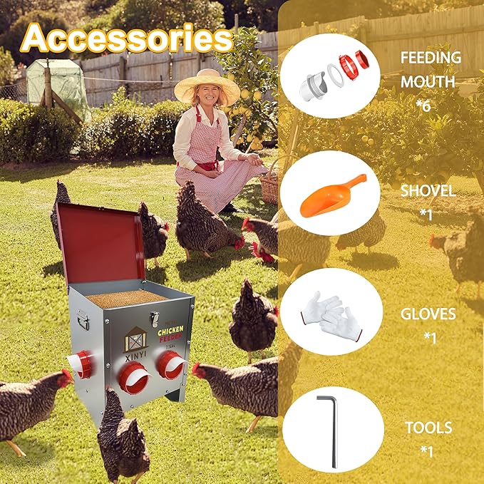 XINYI 35 lb Automatic Chicken Feeder 6 Ports, Metal Chicken Feeder No Waste, Rodent Proof Chicken Food Dispenser System, Weatherproof Duck Feeder 7.1 Gallon